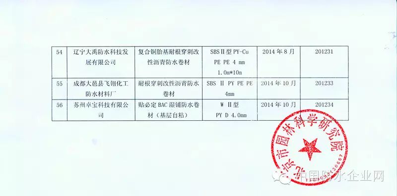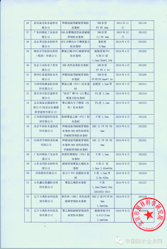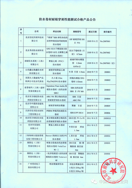 2014年11月6日 ,北京园林科学研究所公告了全部《防水卷材耐根穿刺性能测试合格产品》,共40家防水企业56种产品。